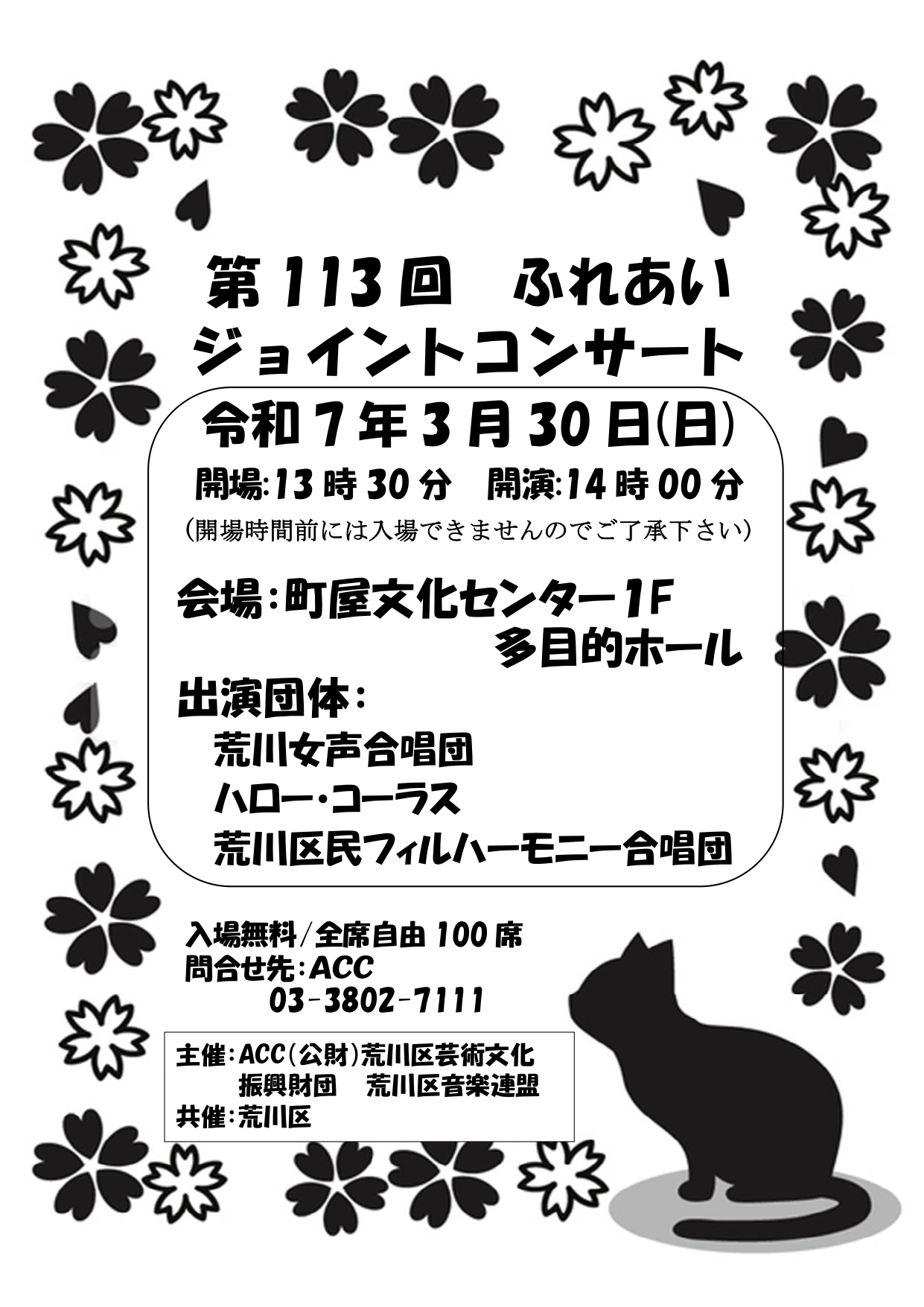 第113回ふれあいジョイントコンサート 2025年3月4日 最終更新日時 : 2025年3月4日 arakawaonren 第113回ふれあいジョイントコンサート 2025年3月30日(日)午後1時30分開場 14時開演(開場時間までお席には入れません)町屋文化センター 1階 多目的ホール入場無料出演団体 荒川女声合唱団 ハロー・コーラス 荒川区民フィルハーモニー合唱団
