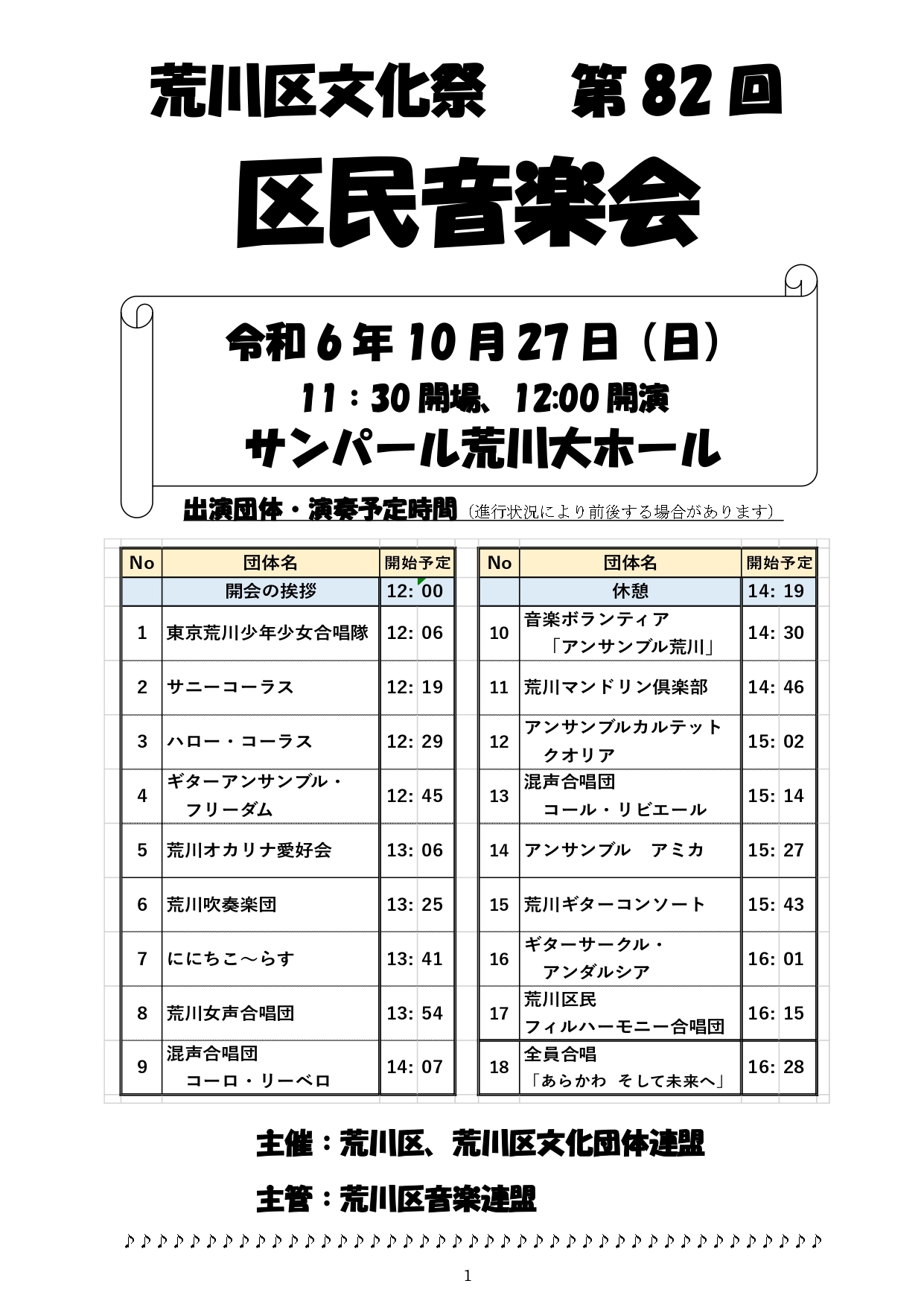第82回 区民音楽会(終演しました) 2024年8月16日 最終更新日時 : 2024年11月12日 arakawaonren 2024年10月27日(日)11時30分開場 12時開演サンパール荒川入場無料(出入り自由) 荒川区音楽連盟加盟団体17団体が参加します。合唱、ギター合奏、吹奏楽、オーケストラ、オカリナ演奏など様々な音楽をお聴きいただけます ☆演奏時間は目安ですので、余裕を持ってお出かけください(^^)/